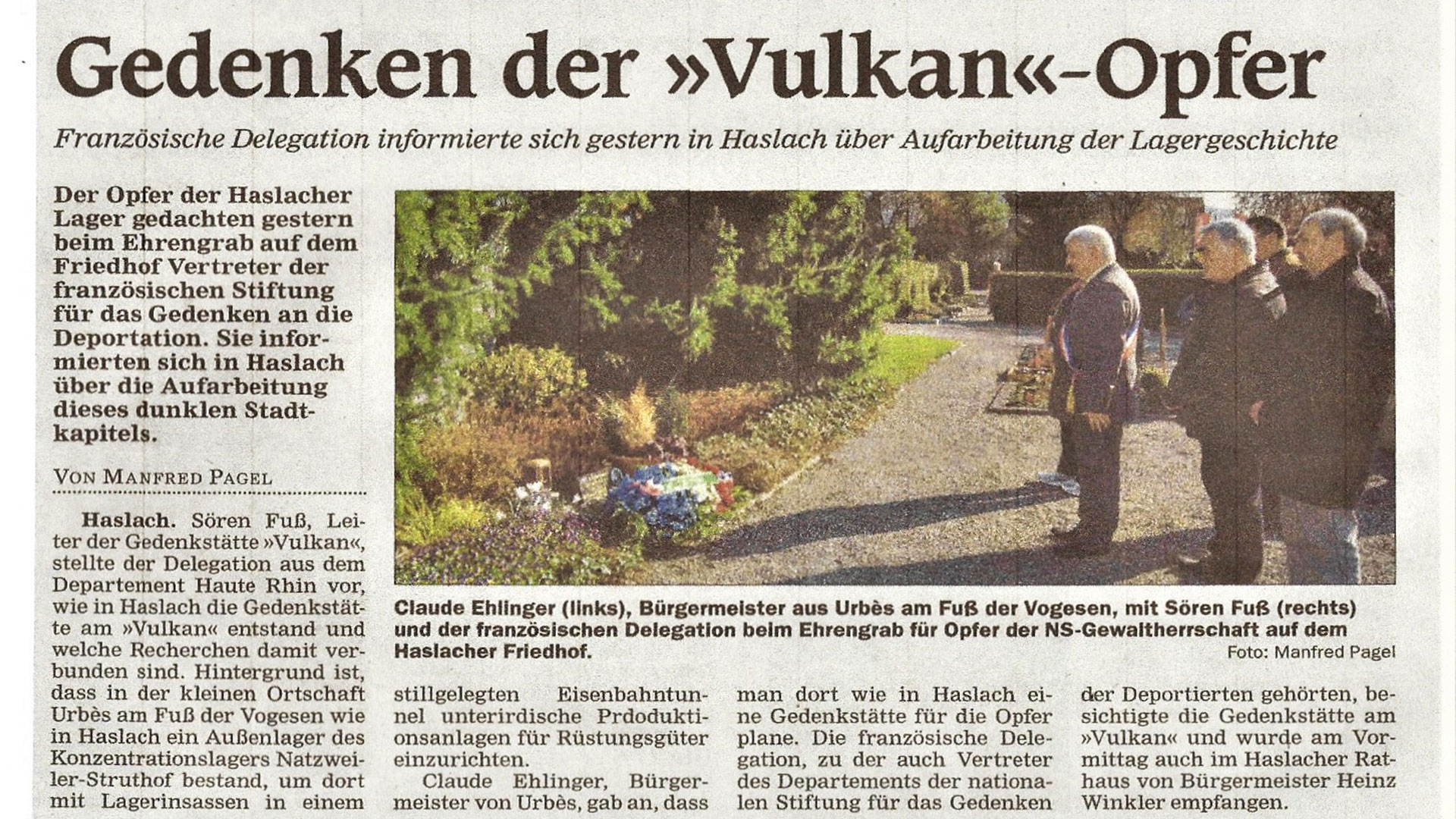 Nachdem sichtbar wurde, dass dieses Ziel vorerst durch die Weigerung der Stadt Offenburg nicht zu verwirklichen war, wurde beschlossen, das Außenlager Urbès-Wesserling des KZ Natzweiler-Struthof in diesen Weg einzubeziehen. Arlette Hasselbach, die Präsidentin der AFMD Haut-Rhin** konnte den Bürgermeister Claude Ehlinger von Urbès überzeugen, mit einer kleinen Delegation die Gedenkstätte VULKAN in Haslach im Kinzigtal in Baden zu besichtigen. Nachdem Arlette Hasselbach den Besuch beim Leiter der Gedenkstätte, den Kamerad Sören Fuß, angemeldet hatte, teilte dieser dem Haslacher Bürgermeister den Besuch der Delegation mit.