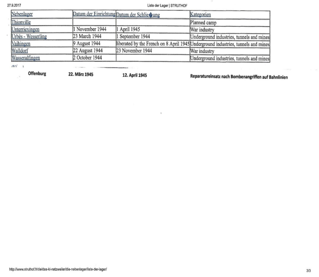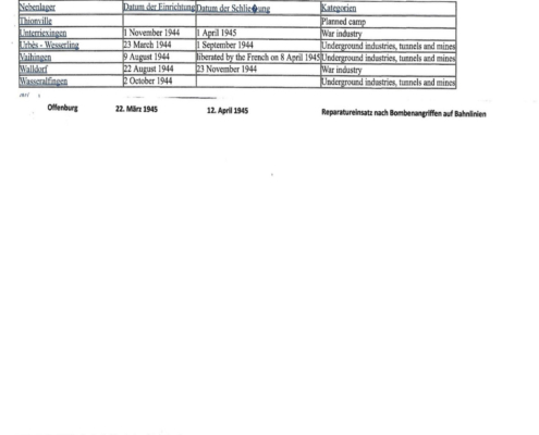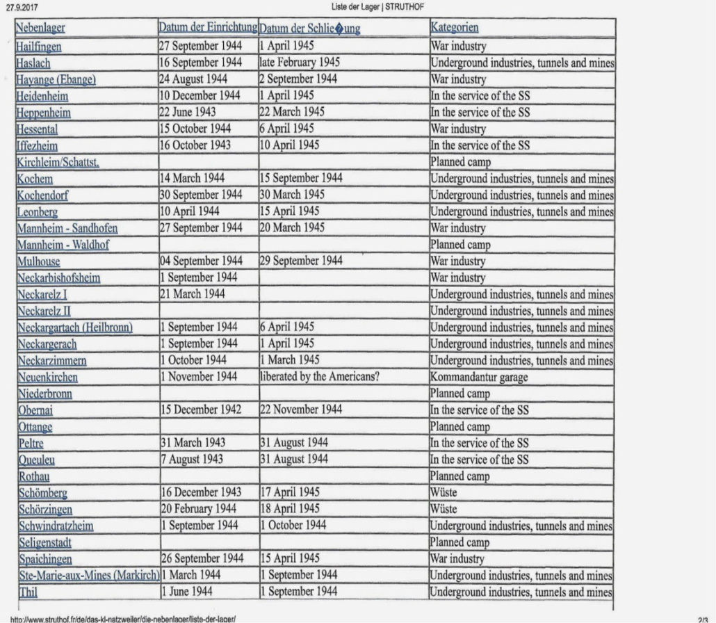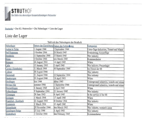 Liste vom zum KZ-Verbund Natzweiler-Struthof verwalteten KZ-Außenlager, hier noch „Nebenlager“ genannt. Das letzte Außenlager in Offenburg ist hier noch nicht aufgeführt. Es bestand von Mitte März bis zum 12. April 1945.